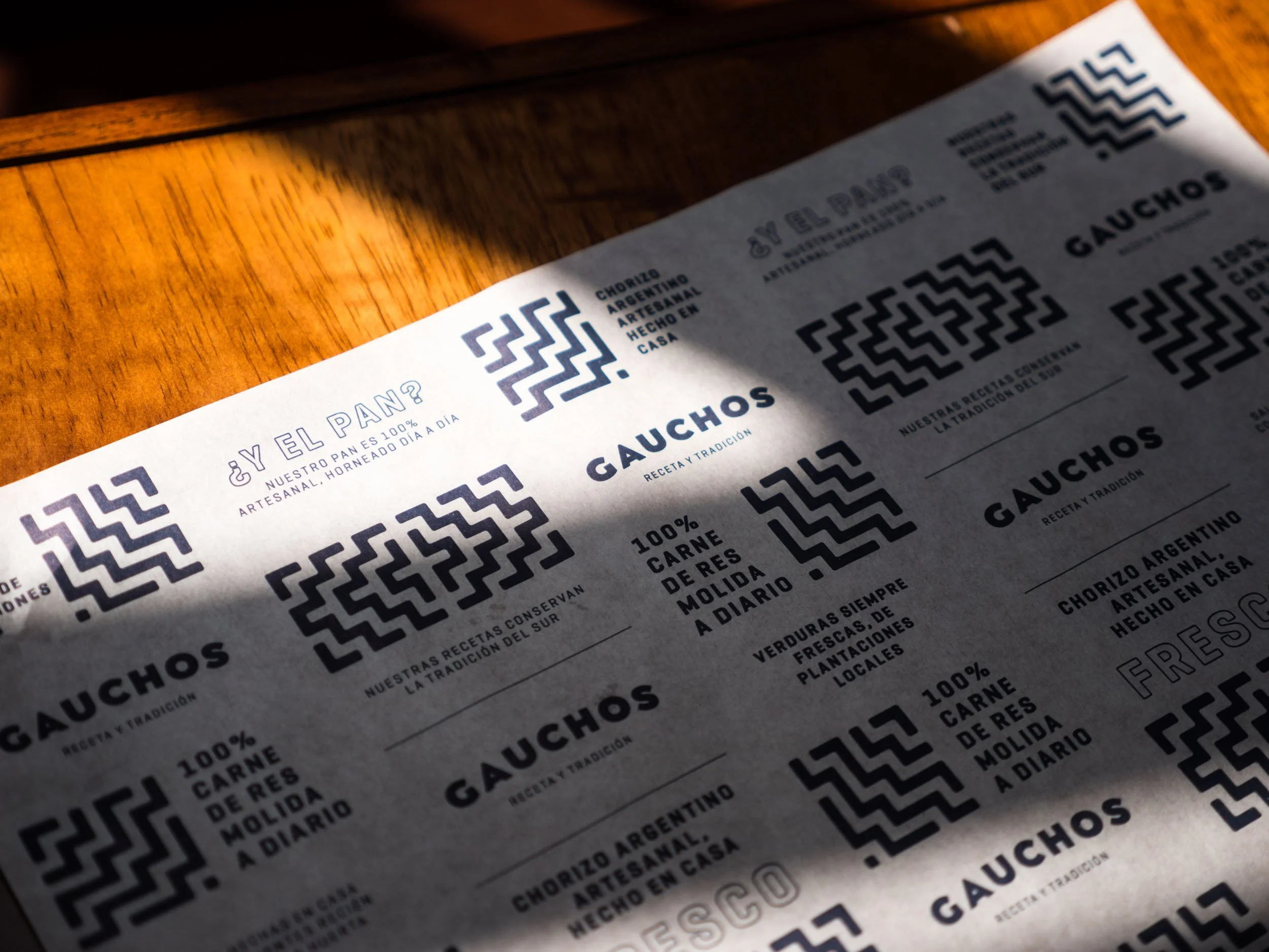 To achieve this, the design focused on key elements of Uruguayan tradition. The visual identity incorporates geometric patterns inspired by the wave designs found on Gaucho ponchos. The use of wood and traditional materials adds authenticity, while a vibrant color palette, drawn from the Uruguayan flag, enhances and modernizes the identity. Gauchos' visual identity is a contemporary ode to the traditional recipe the restaurant is known for.
